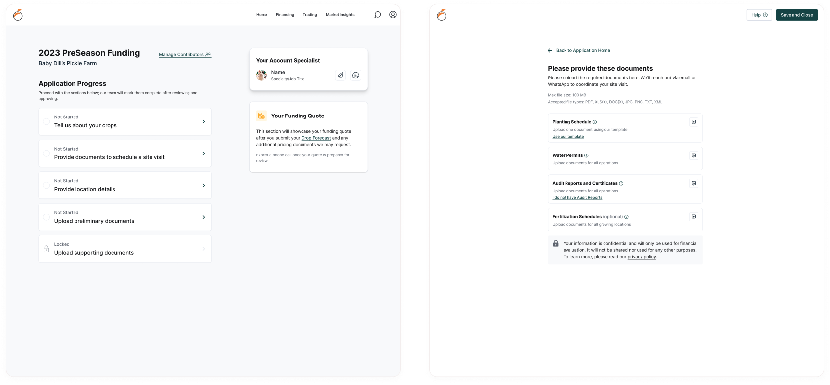 In September 2023, we launched a new workflow allowing clients to apply for Pre-Season funding through our platform. This began with an online prequalification questionnaire, followed by document uploads and funding quote reviews. The MVP included tools like a decision engine for eligibility, crop forecasting, initial quotes, and document management.